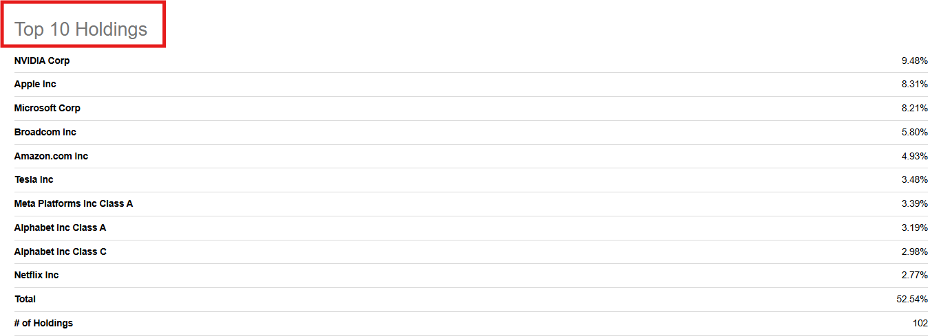 총 102개 종목으로 구성된 QQQ는 그 중 상위 10개 종목이 전체 비중의 절반을 차지합니다.