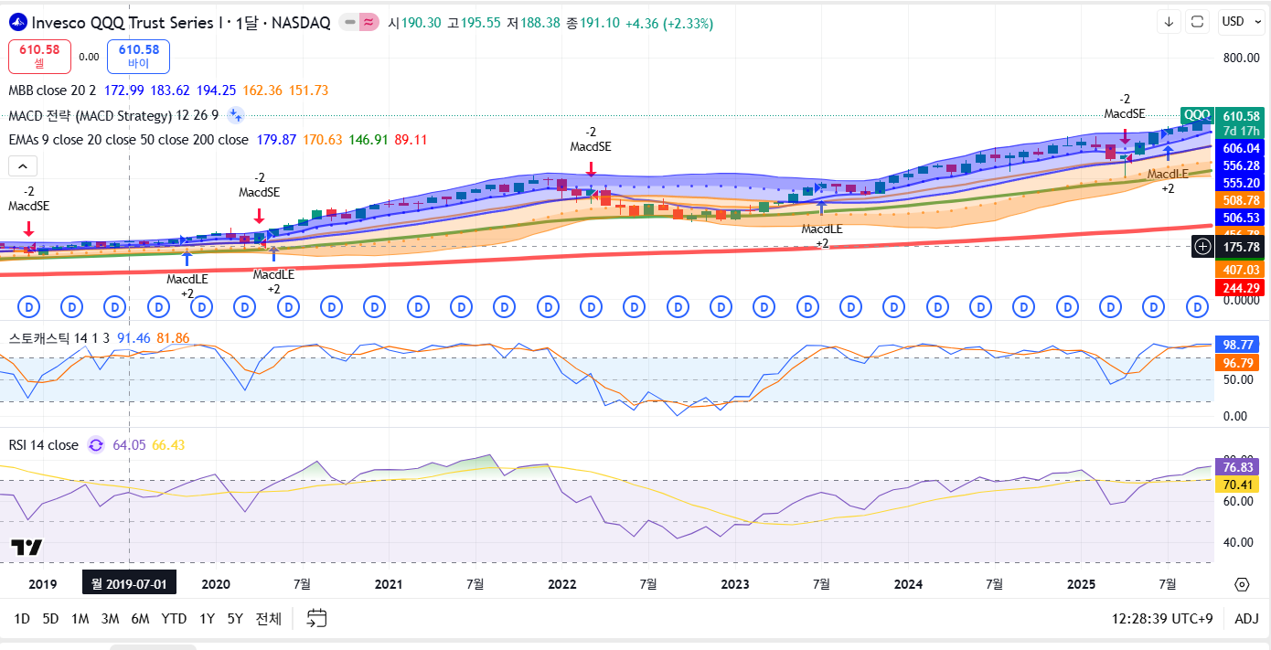 추세와 보조지표를 통해 QQQ의 단기, 중기, 장기 흐름을 확인해볼게요.