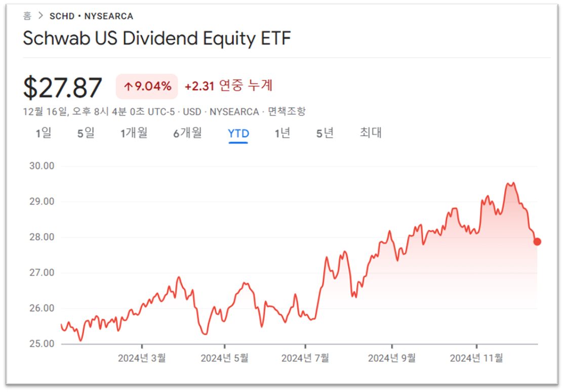 SCHD는 미국의 대표적인 배당 성장 ETF로 안정적인 배당 수익과 장기적인 자본 이득을 추구하는 투자자들에게 인기가 높습니다.