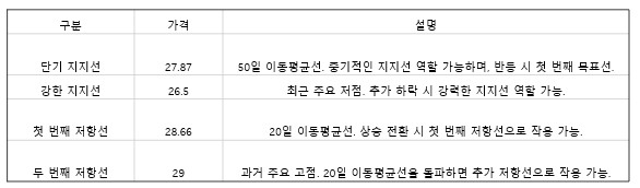 50일 이동평균선 (27.87) : 현재 주가(27.01)는 50일 이동평균선 아래에 위치하고 있는데요, 50일 이동평균선은 중기적인 지지선 역할을 할 가능성이 있으며, 주가가 반등할 경우 이 선이 첫 번째 목표선으로 작용할 수 있습니다.