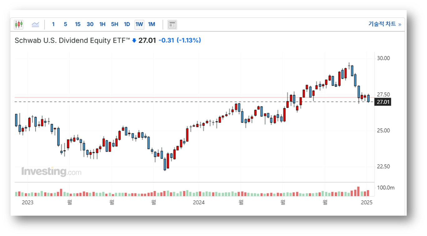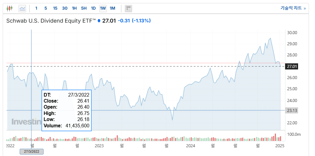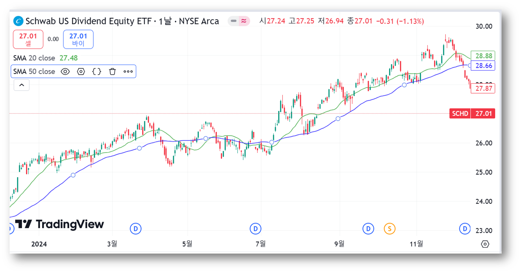 먼저, SCHD 의 주가 현황을 보러 가겠습니다. 최근 많이 주가가 빠졌는데요, 빅테크 위주로 미국장이 호황이었던 반면 소비재 등의 섹터가 많은 SCHD의 경우, 많이 하락을 했는데요, 자세한 주가 현황 살펴보시죠!