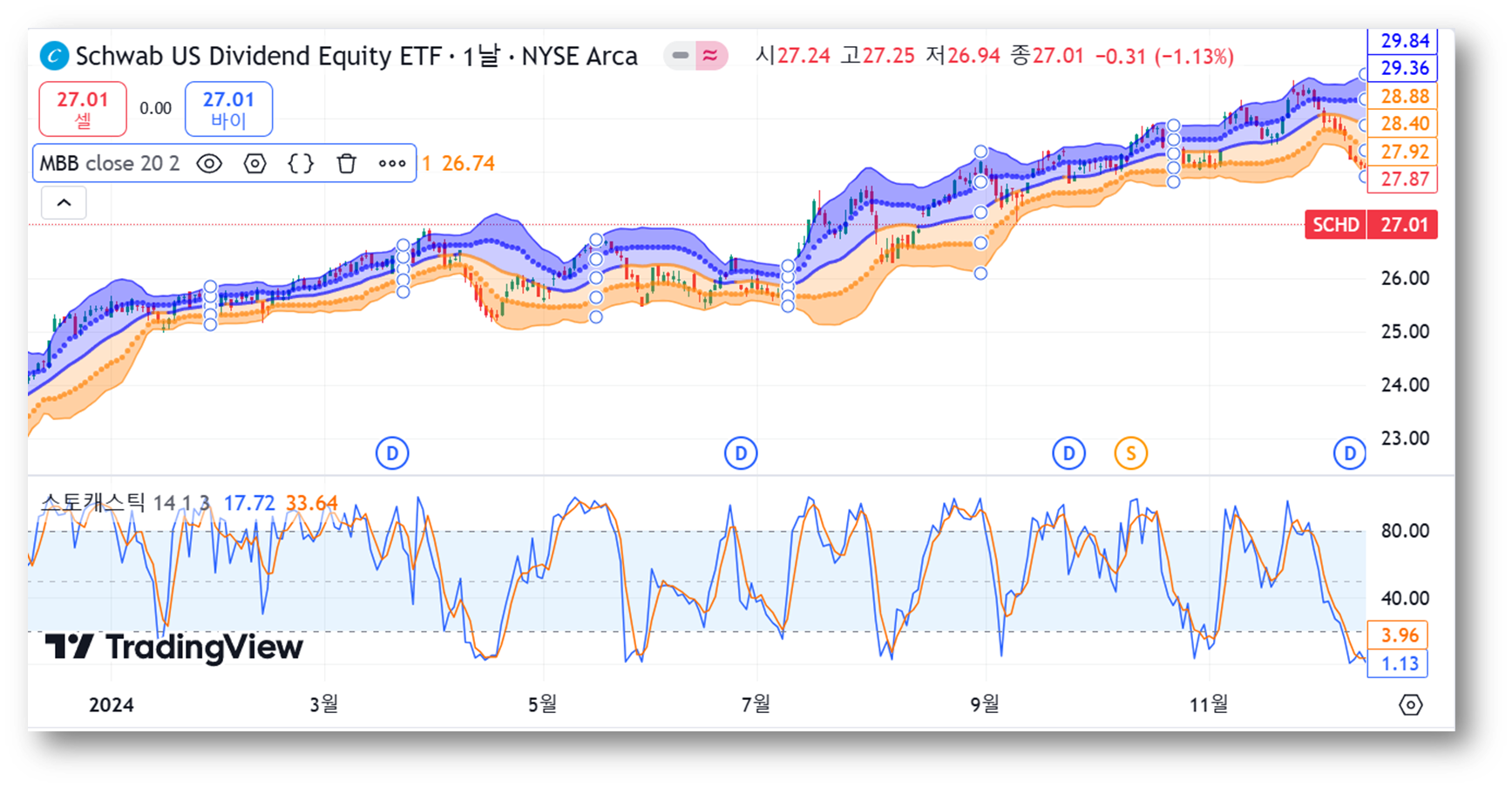 SCHD가 최근 하락세인데요, 이동평균선을 통해 추세 등을 확인해보고, 지지선 얼마대에서 반등이 나올 수 있을지에 대해 알아보겠으며, 그 외 볼린저 밴드/ 스토캐스틱 분석을 통해 단기적인 주가 전망과 중기적 주가 전망을 알아보겠습니다.