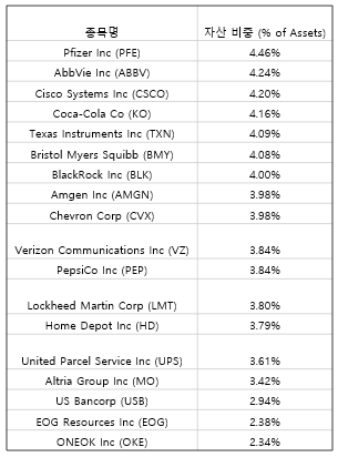 SCHD는 배당 성장률이 높은 기업들을 주로 보유하고 있는데, SCHD 포트폴리오는 어떤 식으로 구성되어 있는지 간략히 살펴보도록 하겠습니다. SCHD 는 103개 종목으로 구성되어 있는데요, 간략히 상위 % 구성하는 종목들만 살펴보도록 하겠습니다. 가장 많은 비중은 화이자로 4.46%이며, 배당주로 유명한 기업들이 대거 속해있습니다. 자세한 내용은 아래 표 참고해주세요.