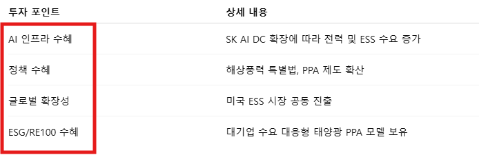 • 중장기 투자자: 해상풍력·태양광 정책 수혜 + AI 인프라 확장 → 성장성 충분