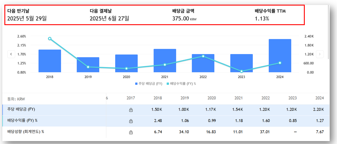 SK하이닉스는 메모리 반도체 특성상 배당금은 낮지만, 최근 실적 회복에 따라 2024년 배당금은 전년 대비 약 83% 증가한 2,200원을 기록했습니다.
