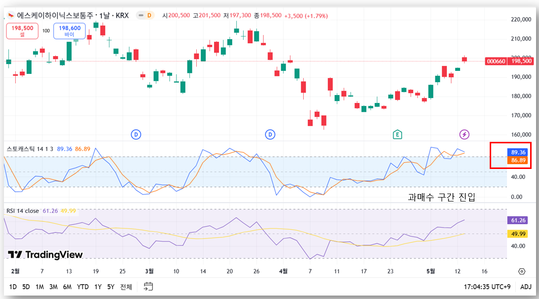 장중 한때 201,500원까지 오르며 4월 초 이후 한 달 만에 20만 원대를 돌파했습니다. 기술적으로는 RSI(61.26) 및 스토캐스틱(89.36) 지표가 과매수 구간에 진입하고 있어 단기 조정 가능성에 유의해주세요!