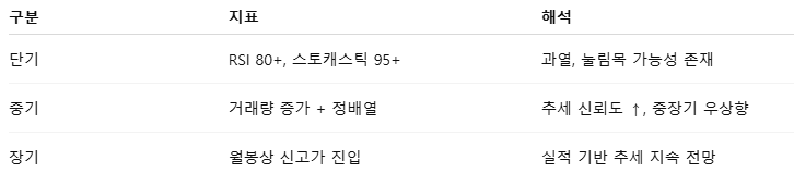 장기적으로는 신고가 영역 진입 중, 실적이 이를 뒷받침하는 만큼 단기 급락보다는 조정 이후 재상승 가능성 높음. 다만, 신규 진입자는 분할 매수로 리스크를 관리하는 것이 유리.
