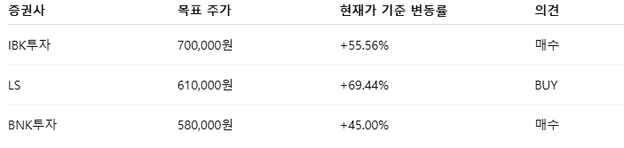 증권사 평균 목표 주가는 약 515,800원 ~ 700,000원 사이로, 상승 여력은 여전히 존재합니다.