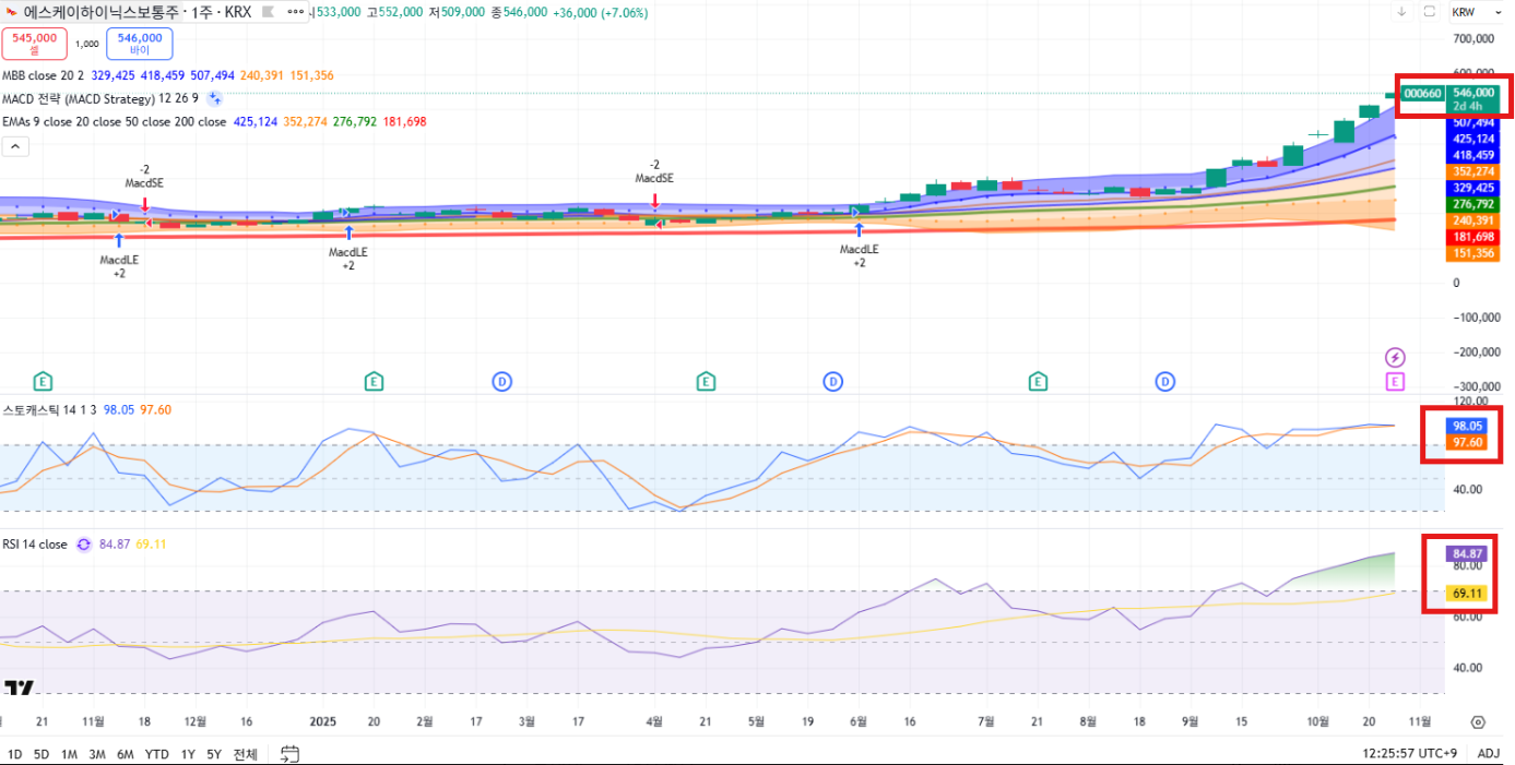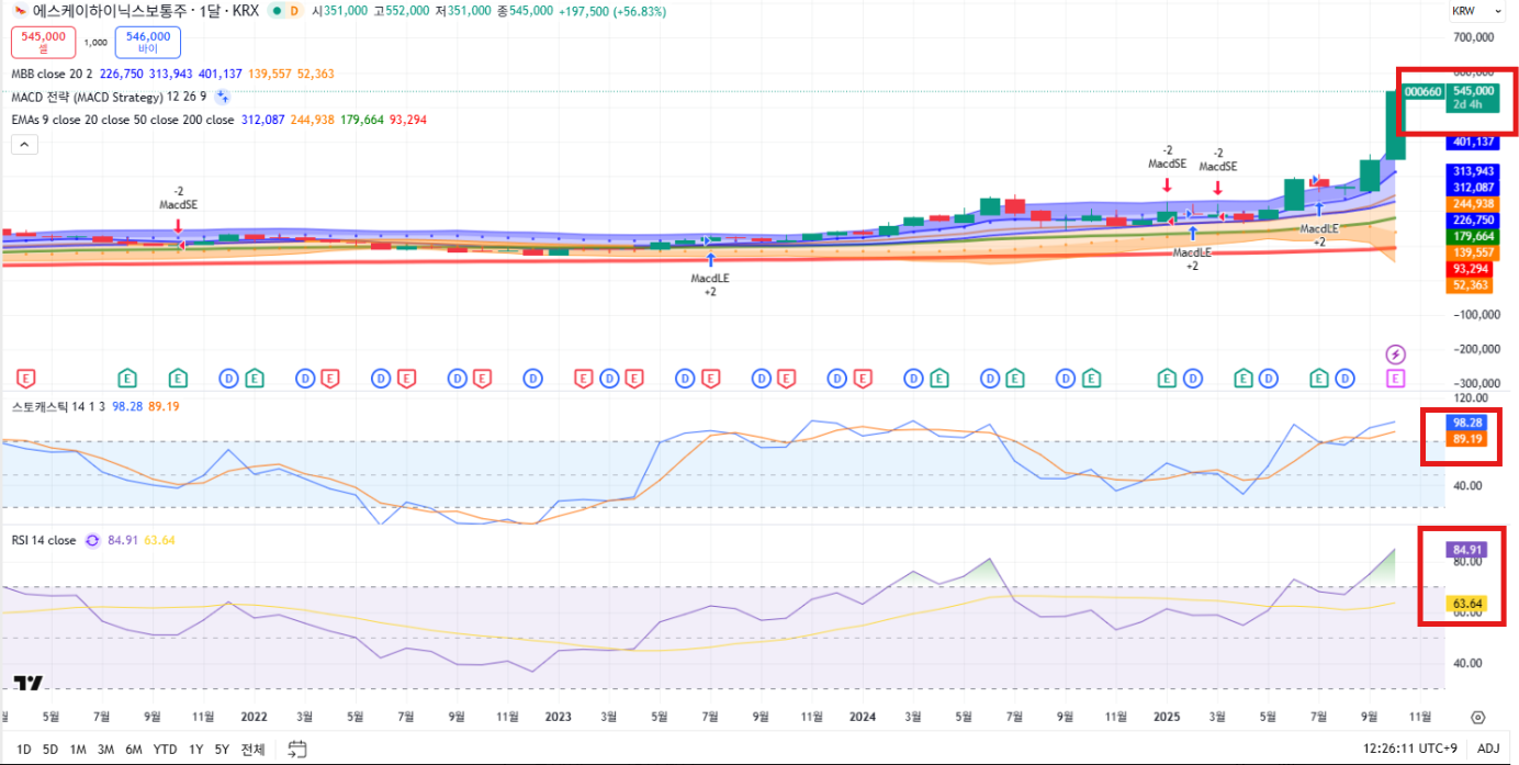 최근 SK하이닉스 주가는 실적 발표와 AI 수요 폭증 기대감으로 단기 급등세를 이어가고 있습니다. 하지만 기술적 지표에서는 과열 신호도 포착되고 있어, 단기 조정 가능성과 중장기 추세 유지 여부를 동시에 점검해야 합니다.