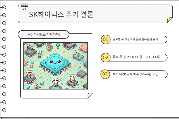 SK하이닉스는 메모리 반도체와 AI 기술이 접목된 미래 성장 산업에서 중요한 역할을 하고 있습니다. 특히 HBM3와 DDR5의 경쟁력을 바탕으로 글로벌 AI 시장에서 높은 점유율을 유지할 가능성이 큽니다.