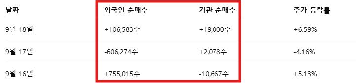 외국인은 9월 초부터 총 2천억 원 이상 순매수하며 주가 상승을 이끌었습니다.