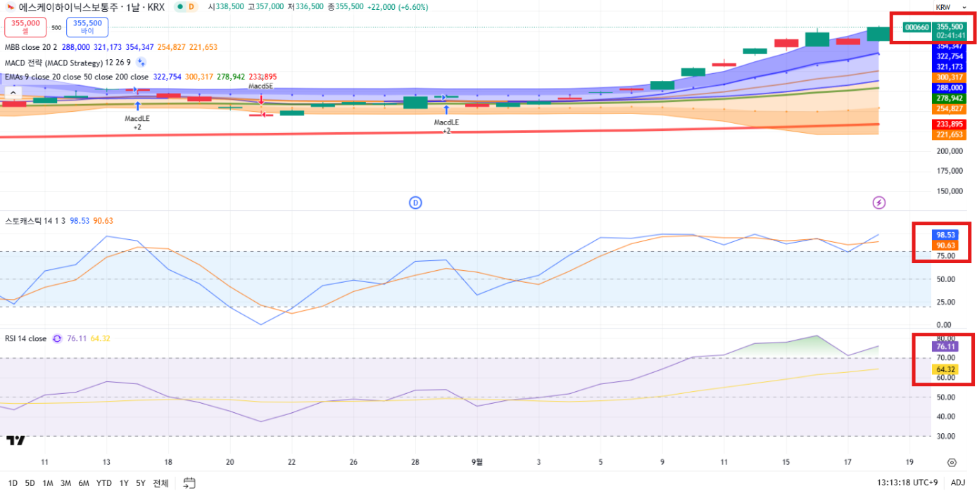 현재 SK하이닉스 주가는 볼린저밴드 상단을 강하게 돌파하며 급등세를 이어가고 있습니다. 5일 평균선 위에서 아름답게 상승 중이고요!