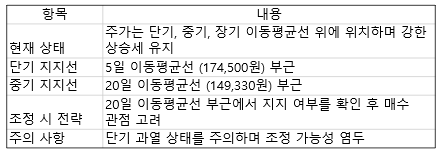 현재 강한 상승세이기 때문에 단기 과열 상태를 주의하면서 조정 시 20일 이평선 부근인 149,330원에서 지지 후 반등이 일어나는지를 보시고 매수의 관점을 갖는 것이 고려됩니다.