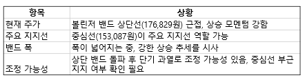 조정 시에는 중심선인 153,087원 부근이 주요 지지선으로 작용할 것으로 보이는데요, 상단 밴드를 돌파 후, 과열 상태로 인해 조정 가능성도 유의해야 합니다.