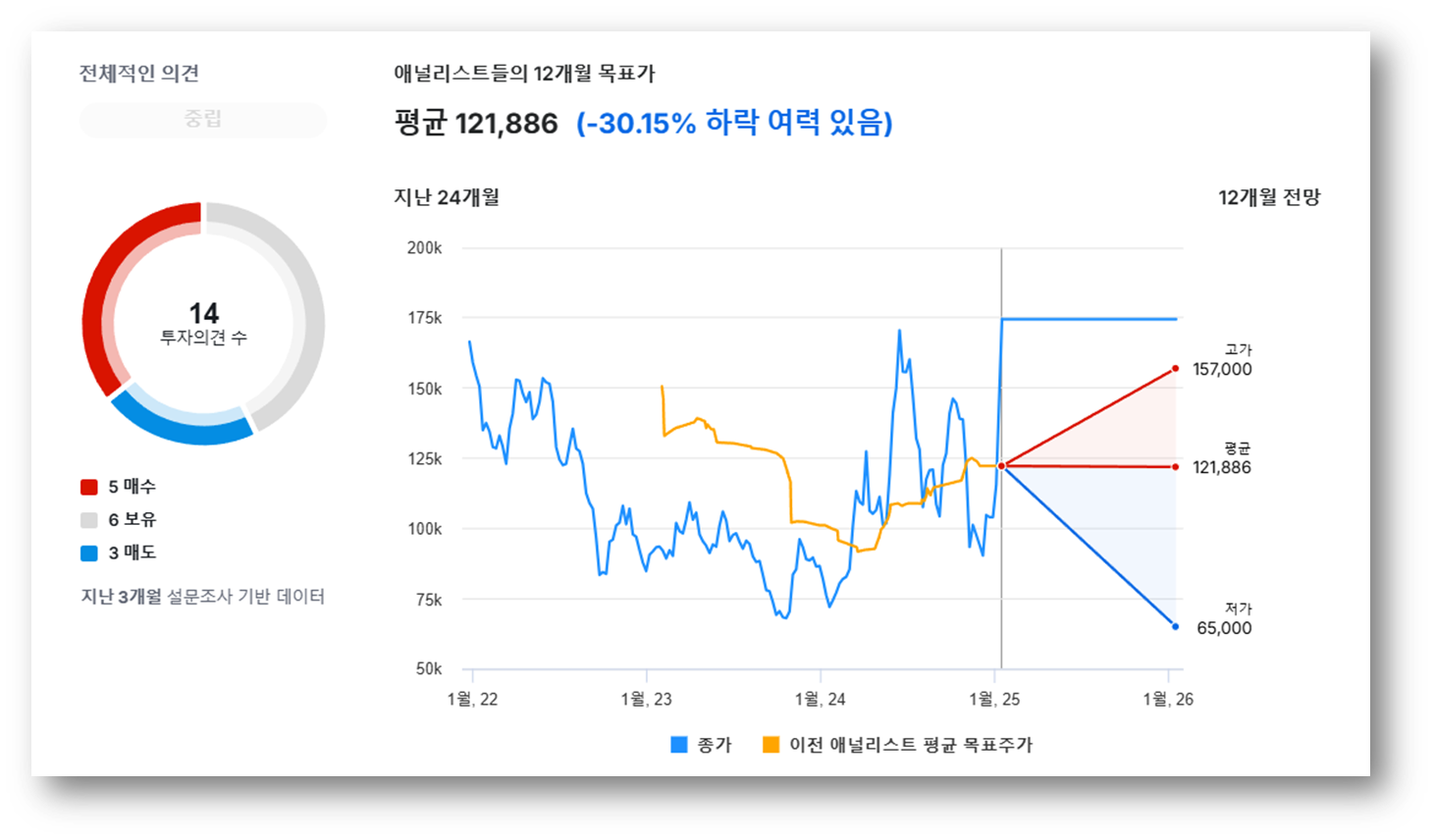 인베스팅 닷컴을 참고로 해서 목표 주가를 알아봤는데요, 평균 목표가는 121,886원으로 현재가 대비 -30.15% 하락이 예상된다고 합니다. 애널리스트들의 목표가는 65,000~ 157,000원까지 제안하고 있으며, 투자 의견에 있어서도 '매수' 5명, '보유' 6명으로 의견이 모아졌습니다.