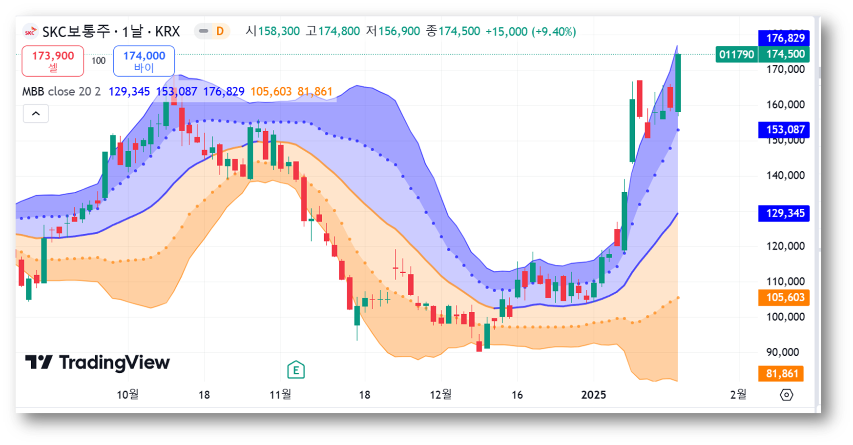 현재 주가는 볼린저 밴드 상단선 부근인 176,829원에 근접했는데요, 이는 상승 추세가 유지되고 있음을 보여주며, 상단 밴드를 돌파하려는 움직임은 강한 상승 모멘텀을 시사하고 있습니다.