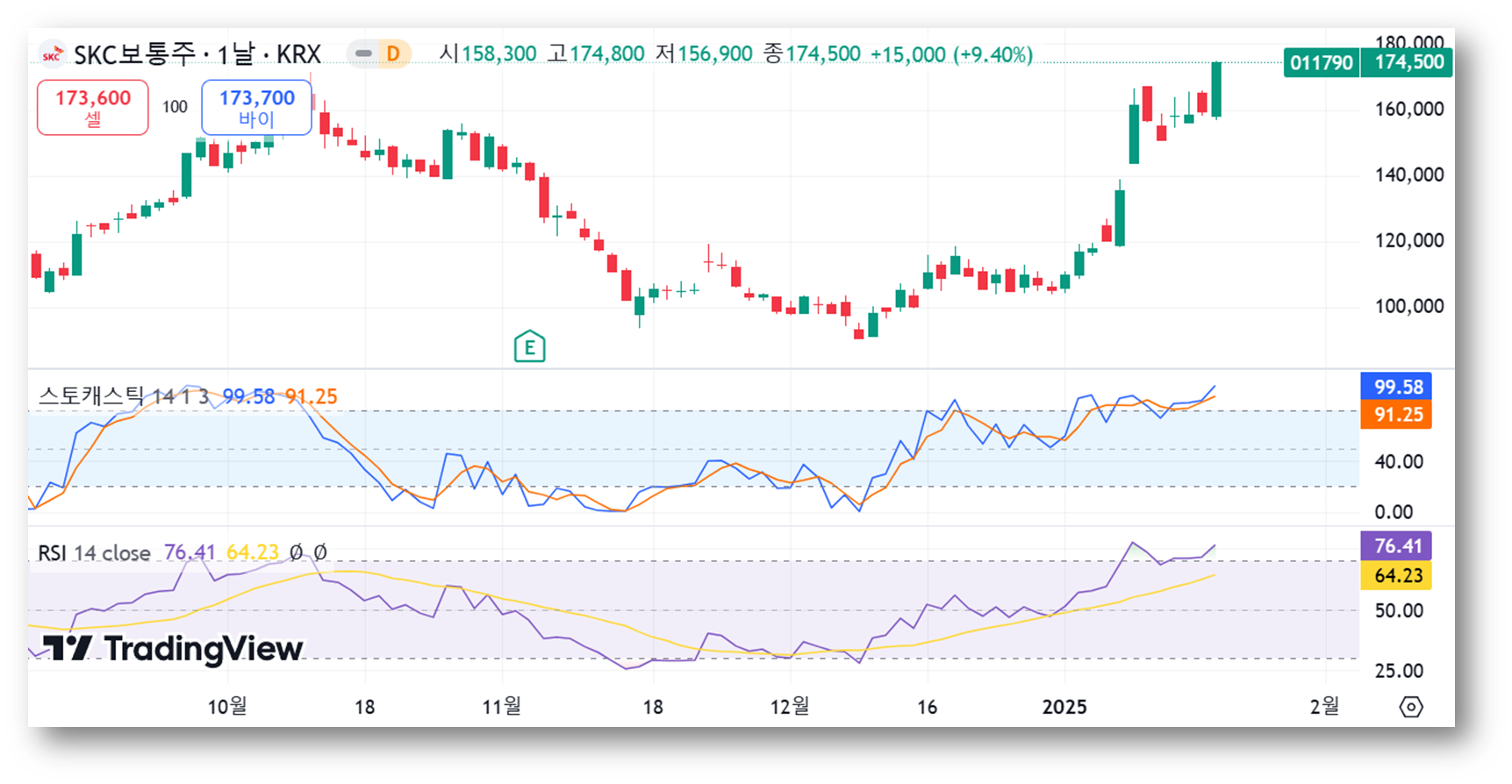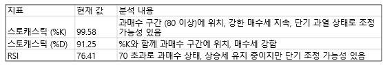 스토캐스틱과 RSI 모두 과매수 구간에 진입해 상승 모멘텀은 강하지만, 단기적인 과열 상태로 조정 가능성이 있어 보입니다. 주가가 과매수 구간에서 장기적으로 머물 경우 추가 상승 가능성도 있지만, 조정 시 주요 지지선을 확인해야 합니다.