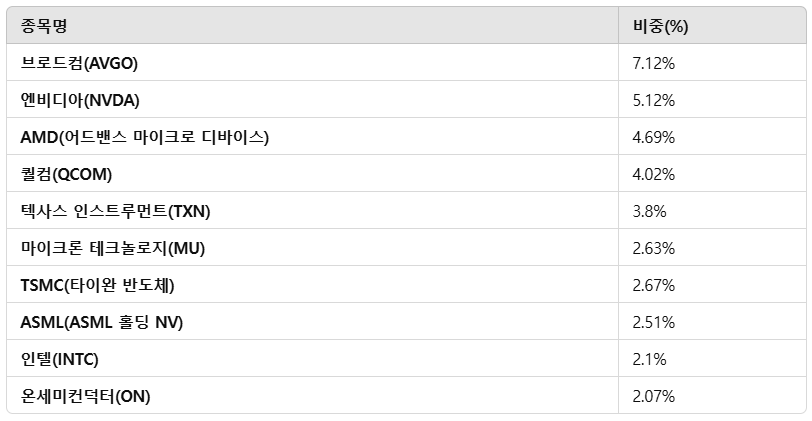 SOXL은 미국 반도체 섹터를 기반으로 하며, 아래와 같은 주요 반도체 기업들로 구성되어 있습니다.