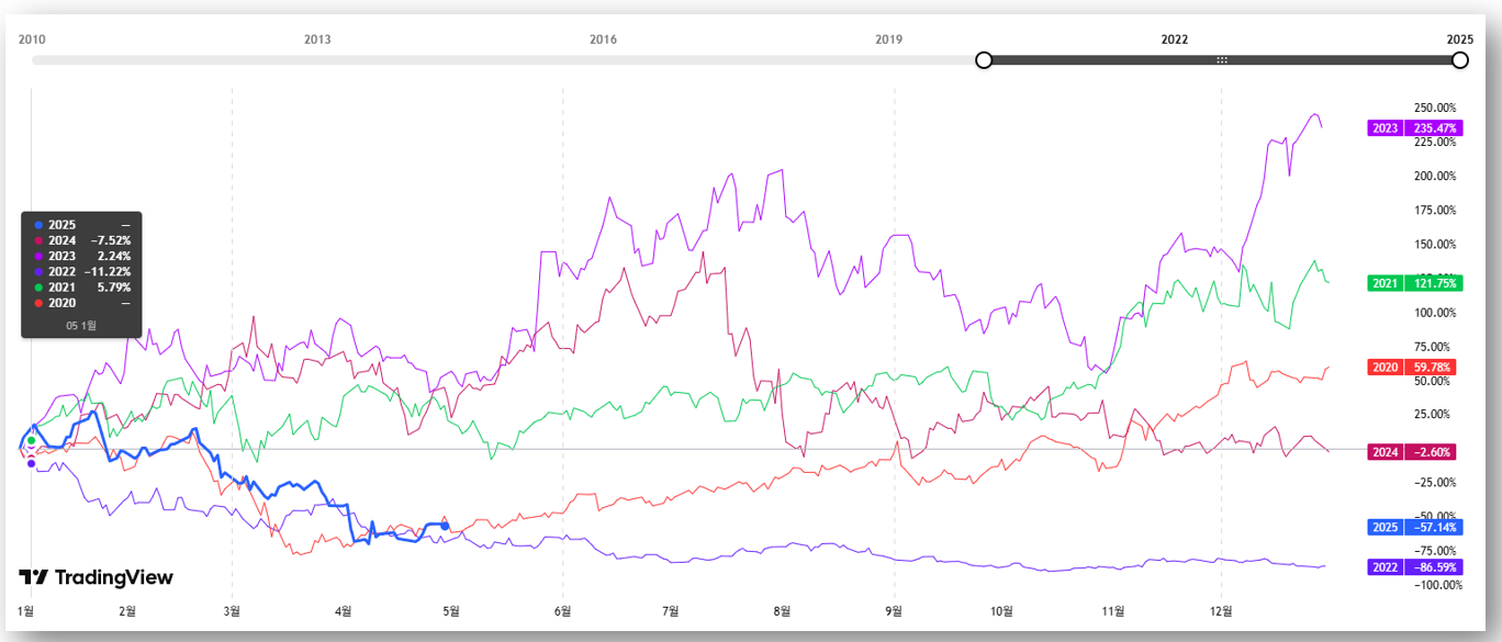 💡 고위험·고수익의 대표 ETF로, 상승장에서는 큰 수익률을 보여주지만 하락장에서는 급락할 수 있습니다. 2023년에는 무려 222.98%의 수익을 올렸으나, 25년 현재는 무려 -54.86%를 기록하고 있는데요, 그만큼 더블바텀 형태 등이 나타나, 상승기에 올라탔을 때 투자하는 것이 유리해보입니다.