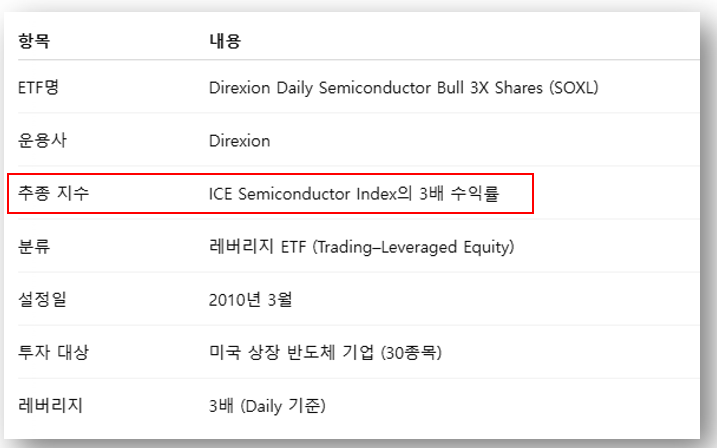 SOXL은 미국 반도체 기업 지수를 3배 레버리지로 추종하는 ETF입니다.