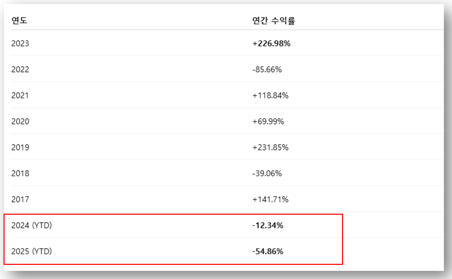 💡 고위험·고수익의 대표 ETF로, 상승장에서는 큰 수익률을 보여주지만 하락장에서는 급락할 수 있습니다. 2023년에는 무려 222.98%의 수익을 올렸으나, 25년 현재는 무려 -54.86%를 기록하고 있는데요, 그만큼 더블바텀 형태 등이 나타나, 상승기에 올라탔을 때 투자하는 것이 유리해보입니다.