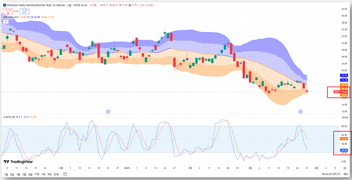 현재 SOXL은 단기적으로 과매도 구간에 진입해 있으나, 추세 반전 신호는 아직 부족한 상황입니다. 고위험 고수익을 노리는 투자자라면 분할 매수 전략을 고려해볼 수 있겠지만, 철저한 리스크 관리가 필수입니다.