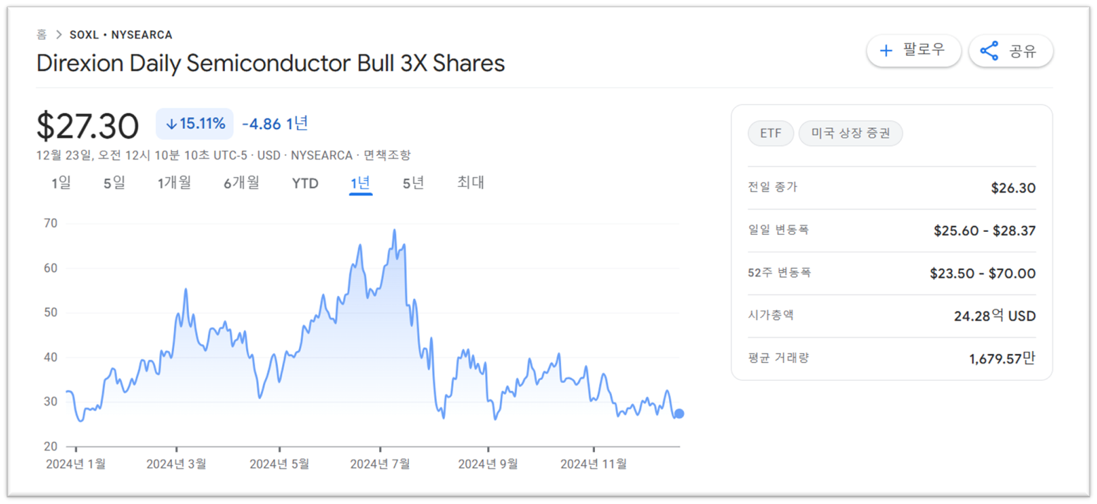 | 시장 변동 | - SOXL은 3배 레버리지 상품으로 단기 변동성에 민감 - 단기 주가 변동이 크므로 투자 시 주의 필요 |
