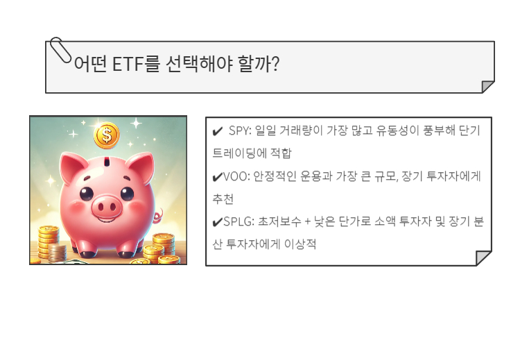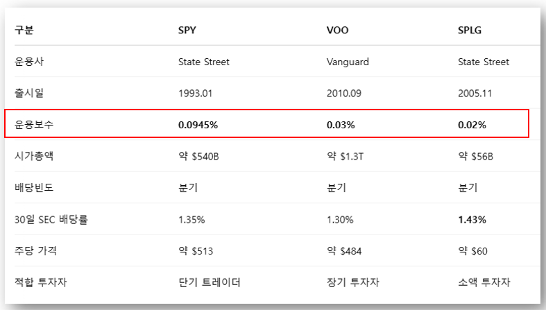 오늘은 대표적인 S&P 500 ETF인 SPY, VOO, SPLG 3가지를 비용, 수익률, 배당 등을 비교해보도록 하겠으니, 투자에 참고하시길 바랍니다.