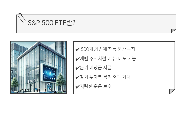 S&P 500 ETF는 미국 주식 시장의 대형주 500개를 포트폴리오로 담은 상장지수펀드입니다.