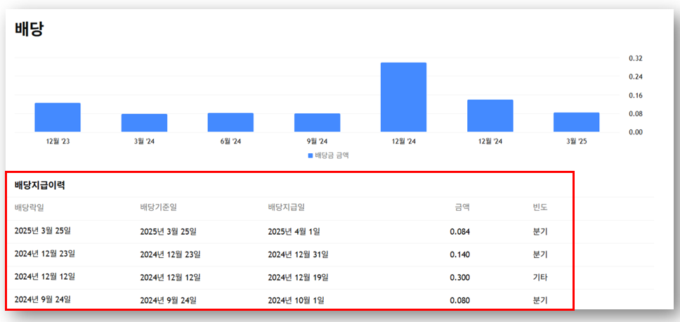 • 최근 배당금: 2025년 3월 25일 기준 0.084달러